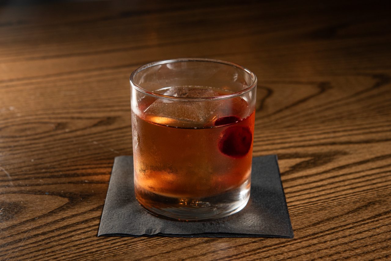 Elevated Old Fashioned, aged in our custom oak barrel, curated whiskey blend with Old Forester, local maple syrup, Luxardo Cherry, Campari, Punt e Mes vermouth, cognac & tobacco bitters